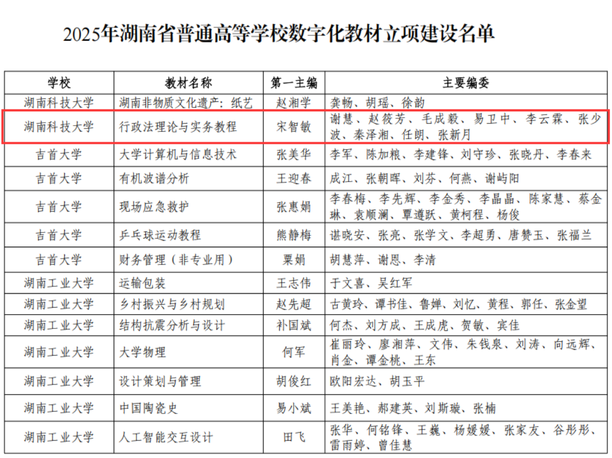 宋智敏教授主持申报的《行政法理论与实务教程》教材项目,经单位推荐、专家评审与公示程序,成功入选省级数字化教材立项建设名单。