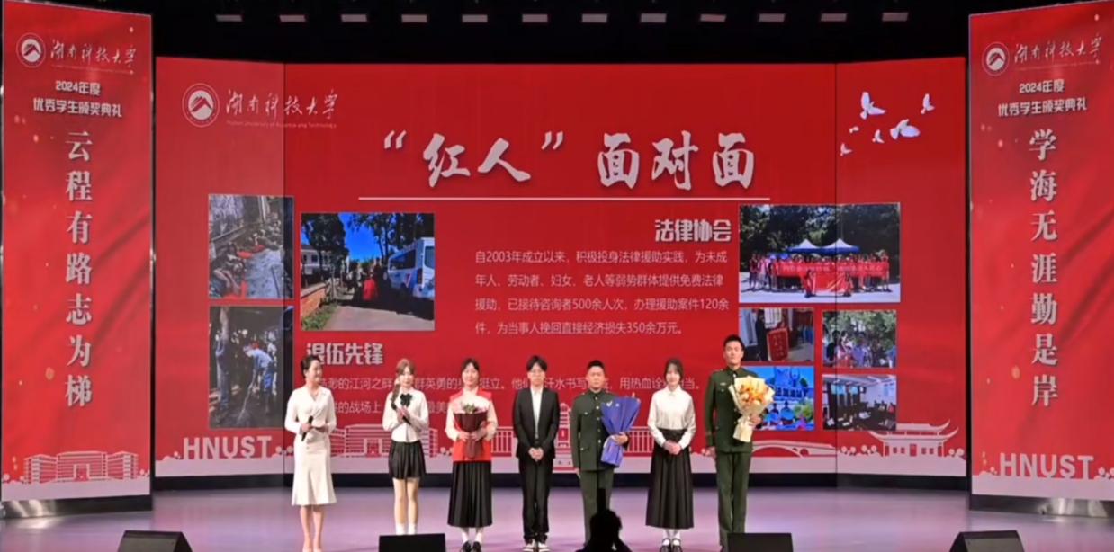 2024年度优秀学生颁奖典礼在此隆重举行。在这场汇聚了众多杰出学生的盛会中,法律协会志愿者黄雨嘉受邀参与了此次典礼的“红人”面对面访谈环节,与退役先锋的两位抗洪英雄们一同分享日常活动中的故事。
