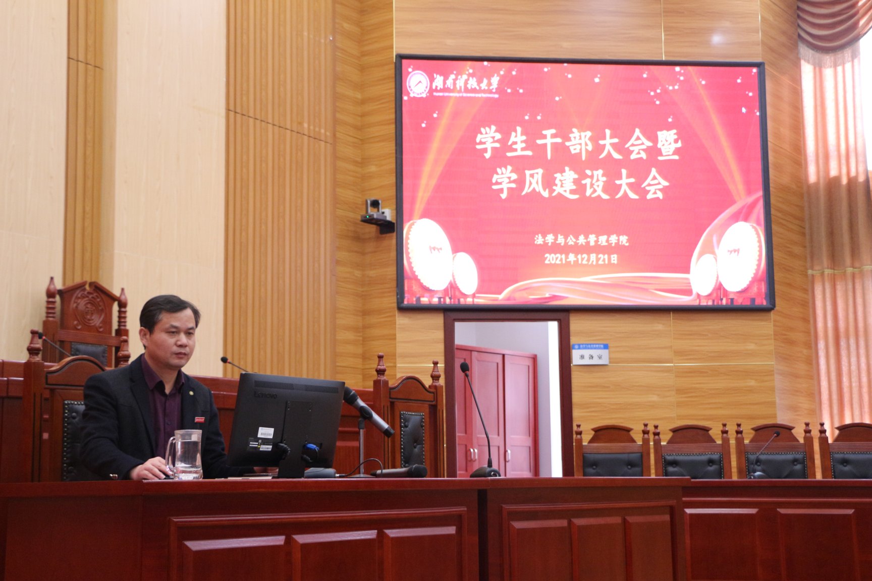 学风建设是高校永恒的话题,也是办学的灵魂所在。2021年即将过去,在新学年即将到来之际,为了总结近年学院学风建设情况,查问题、找差距、定目标和寻对策,法学院与公共管理学院在12月4日、14日和21日分别召开了以学风建设为主题的学院党政联席会议、全体教职工大会和全体学生干部大会。系列会议均由学院党委副书记叶军主讲。