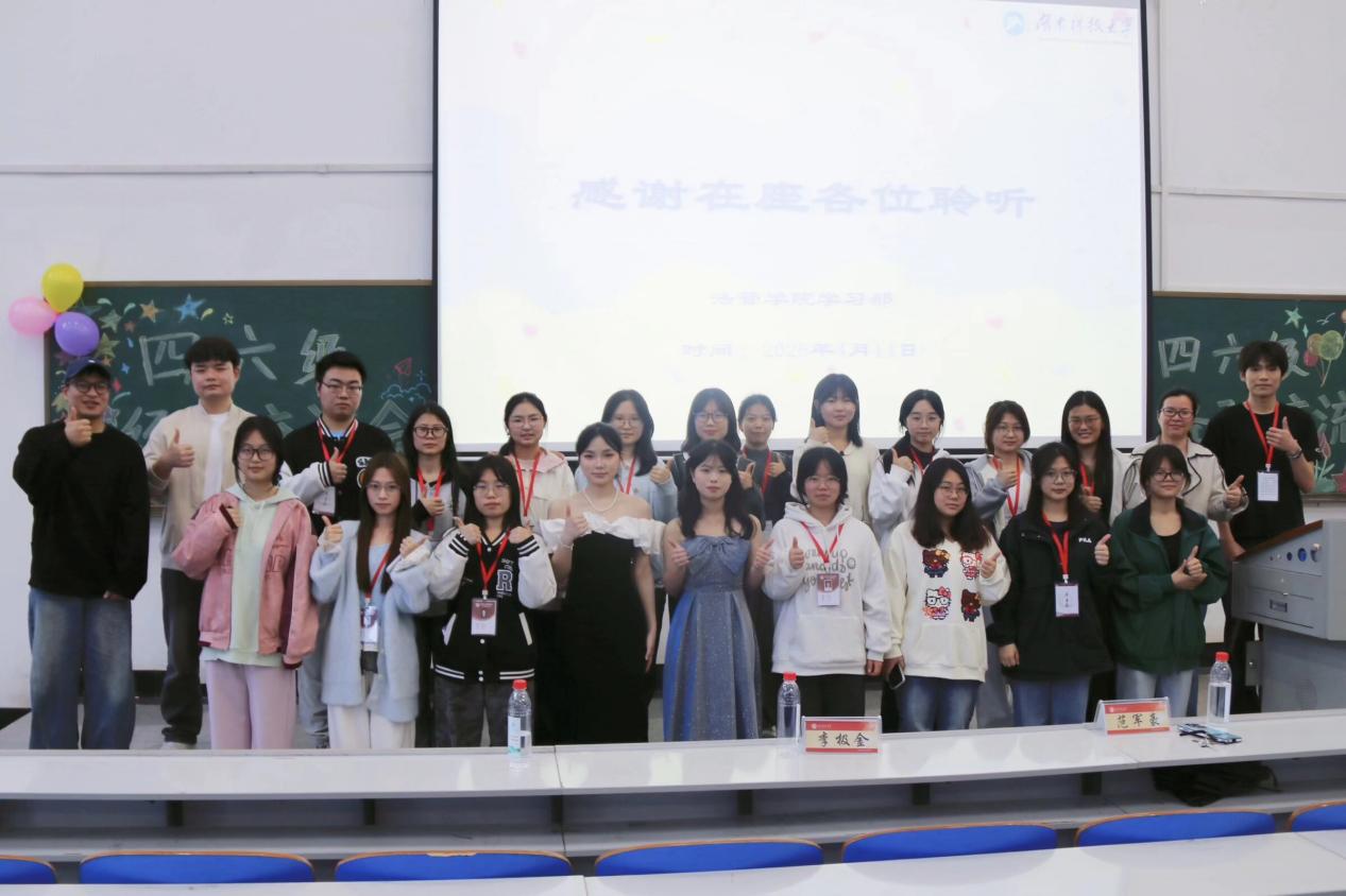 为培育良好学风,增强学生英语能力与综合竞争力,4月14日下午三点,学院在第一教学楼504教室召开了英语四六级经验交流会暨表彰大会。学院党委副书记范军豪、25级辅导员李极金莅临现场,25级全体同学共同参与。