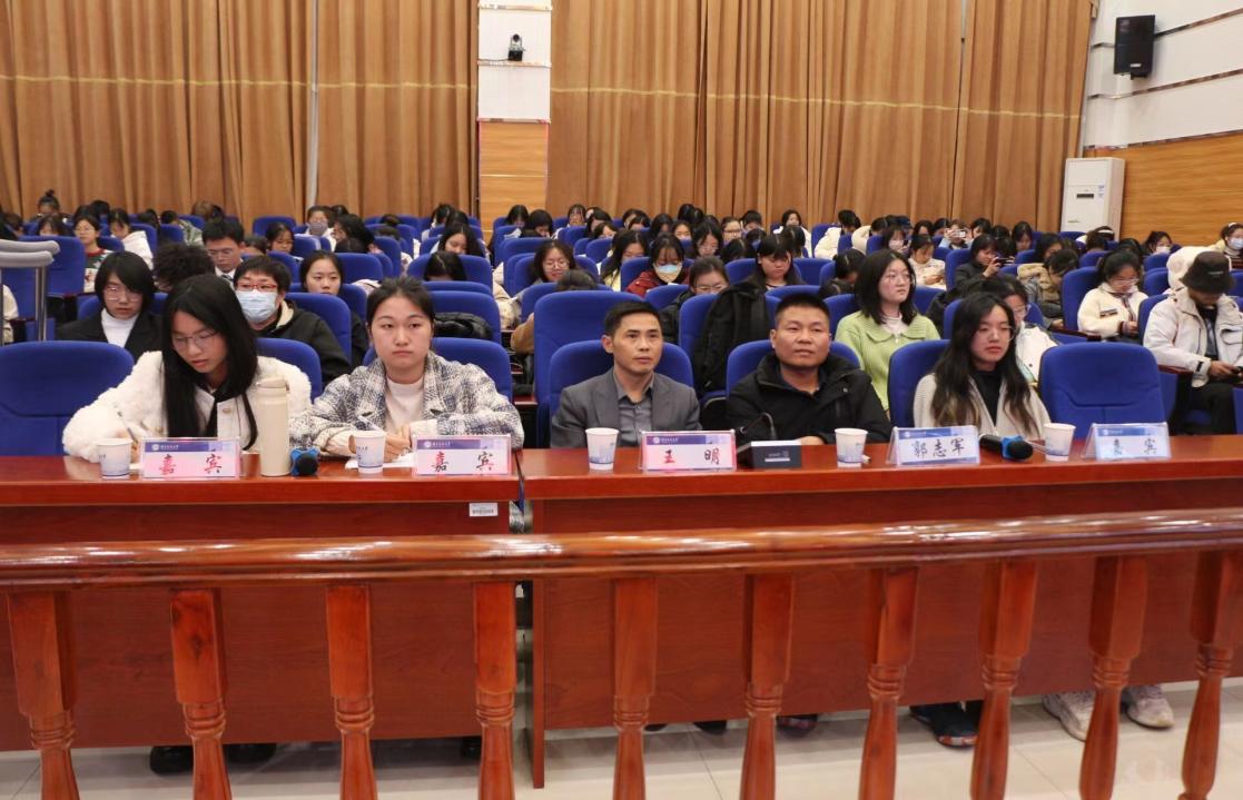 副院长王明、辅导员郭志军、就业服务部部长王涵仪以及第六届大学生职业生涯规划大赛获奖选手廖艺歆、黎宇晴。评委们从演讲时的仪态、演讲的具体内容以及临场发挥等几个方面为选手们进行评分。