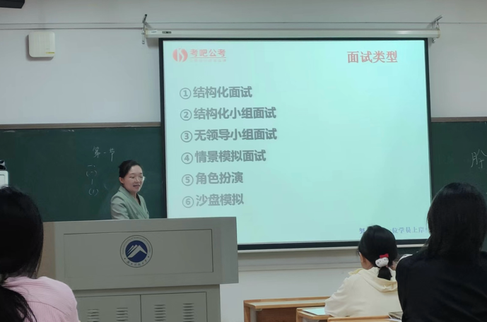 第十届公务员考试全真模拟大赛面试培训于立言楼A212顺利举办,培训有助于各位考生提前适应面试流程,熟悉面试题型,掌握面试技巧,从而在真正的面试中能够发挥出最佳水平。此次培训由考吧教育李亚芳老师主讲,主要从面试考情考务分析、面试流程详解、五大题型详解三个部分开展。