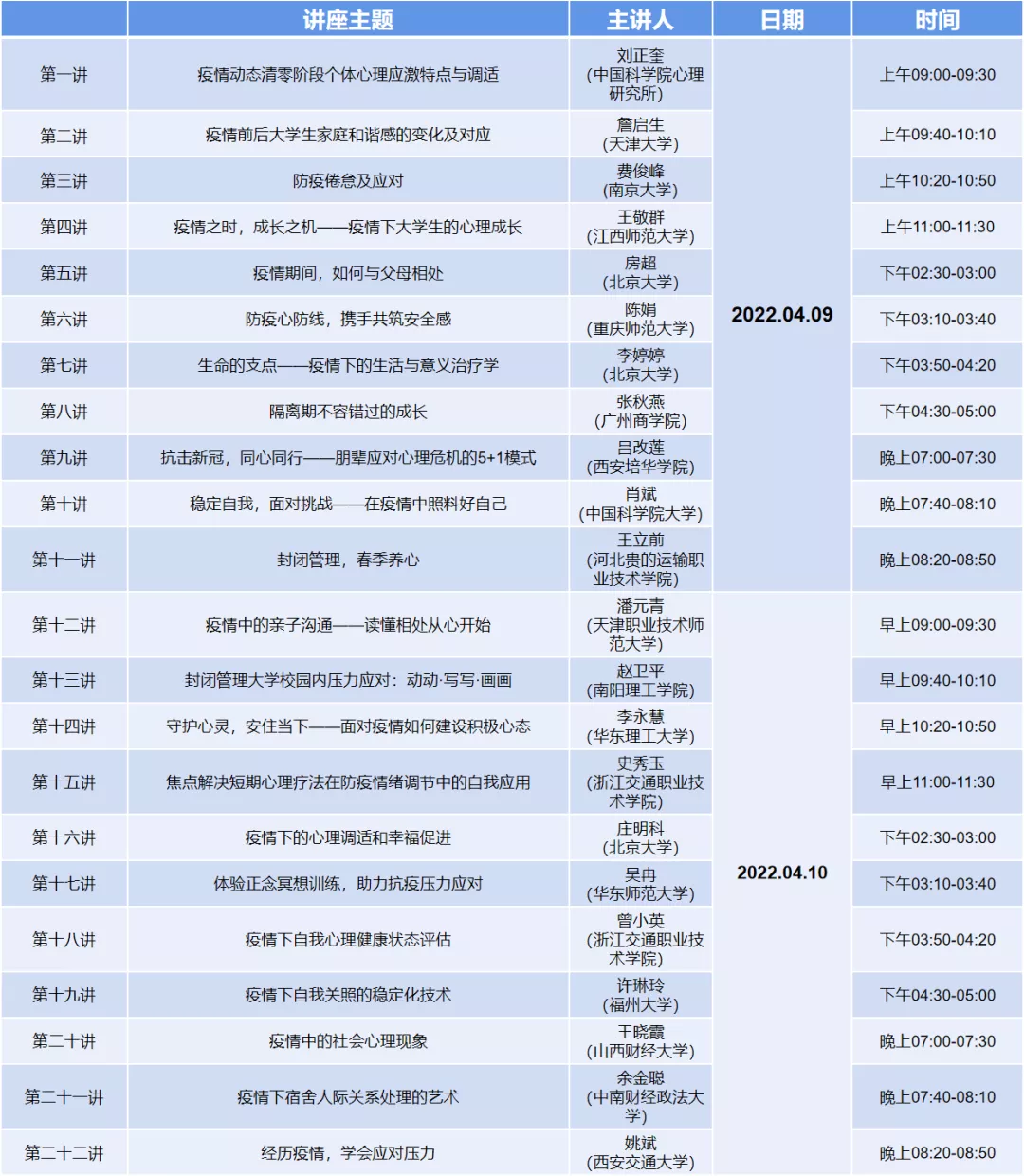 随着全国多地陆续发现多起新型冠状病毒肺炎确诊病例,各地纷纷实行封禁政策,在校大学生群体中出现诸多心理健康问题,因此,中国心理学会心理危机干预工作委员会及全国高校心理委员研究协作组织于2022年4月9-10日面向全国高校学生开展“抗击疫情全国心理委员大讲堂”系列公益讲座。色色动漫