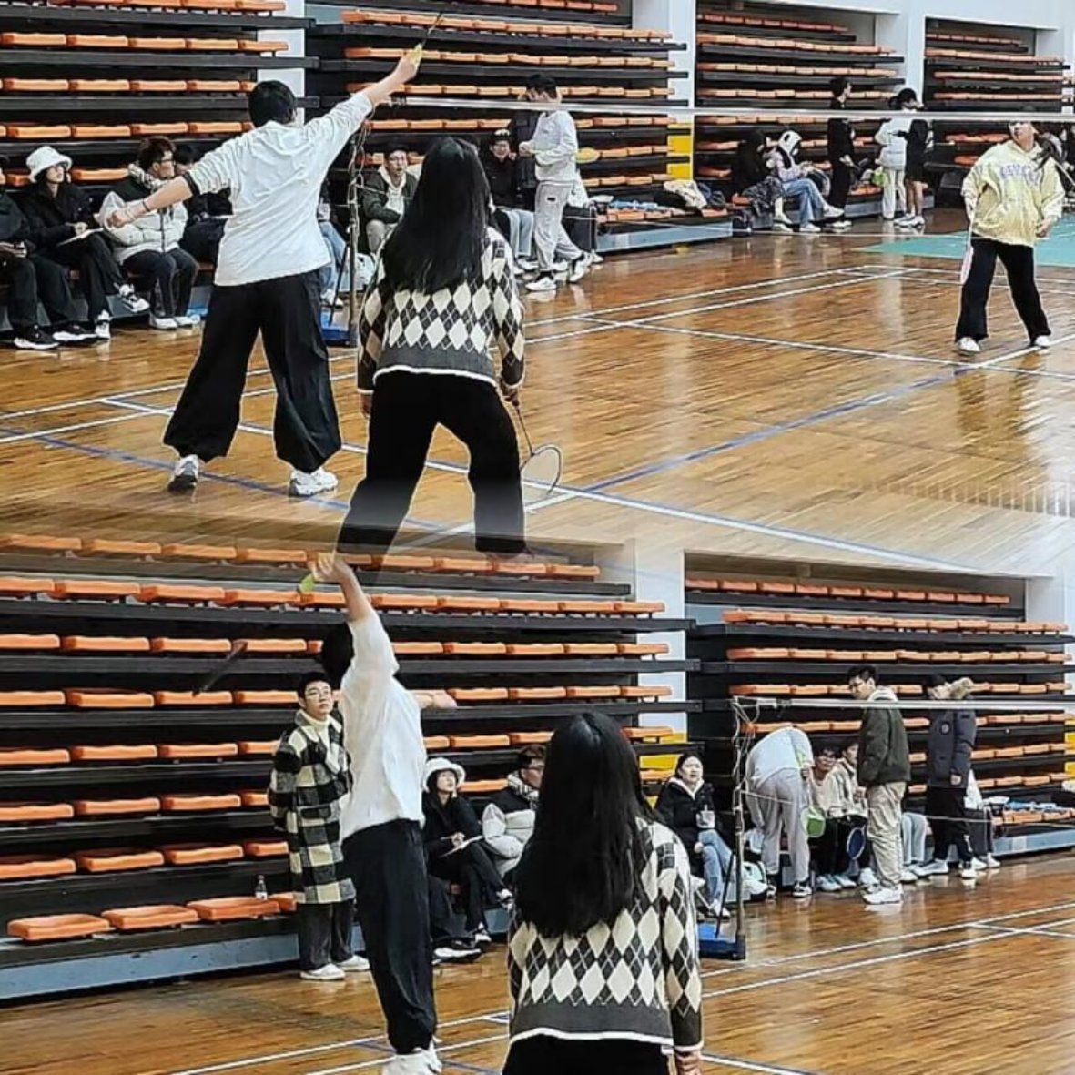 本次新生杯羽毛球赛以团体赛的形式进行,包含混双、男双、女单、男单四个项目。比赛选取团体积分及 21分三局两胜制,每个项目的优胜队伍加1积分。运动员们被随机分配为四队,分别为:“书上也妹说该叫啥队”、“对手勾对角偷后场真的不队”“要不你俩凑一队”“亲亲这边建议您退队”。
