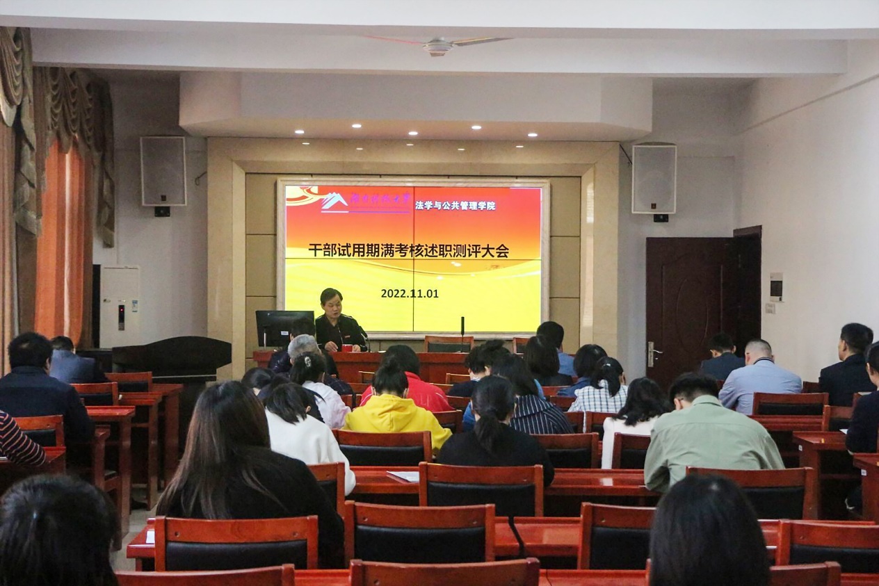 于在立言楼A425召开干部试用期满考核述职测评大会,对邱帅萍同志任法管学院党委书记试用期满进行述职测评。会议伊始,邱帅萍同志进行公开述职,对过去所做工作、取得成绩、存在问题等进行总结汇报。随后,由工作人员发放测评表,全体与会教职工结合邱帅萍同志的述职报告及平时实际表现,从德、能、勤、绩、廉等五方面开展测评工作,做出客观公正,实事求是的评价。最后,由工作人员回收测评表,交由党委组织部、纪委办公室负责统计。