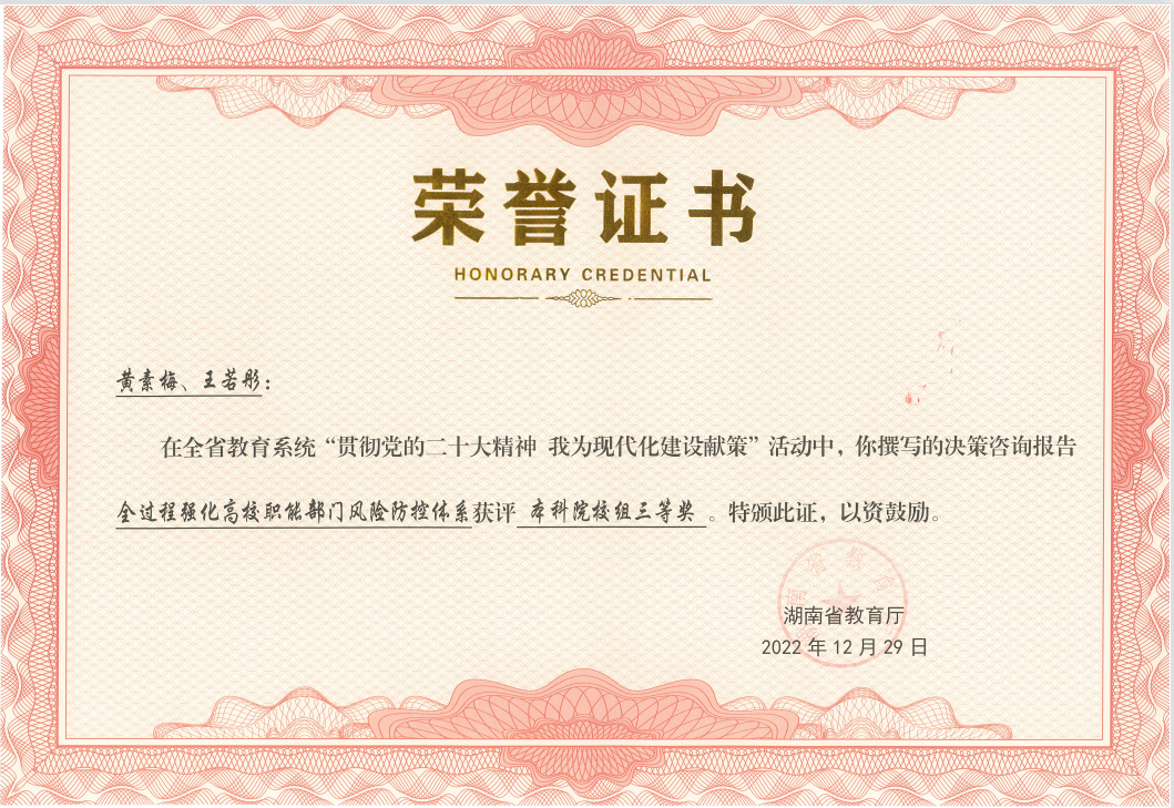 近日,湖南省教育厅公布了“贯彻党的二十大精神 为现代化建设献策”活动评审结果,我校5名教师获奖,学校获“优秀组织奖”,获奖数位列全省高校第三。我校党委书记唐亚阳教授的决策咨询建议《以科技创新引领高端海工装备强省建设》荣获一等奖。色色动漫
