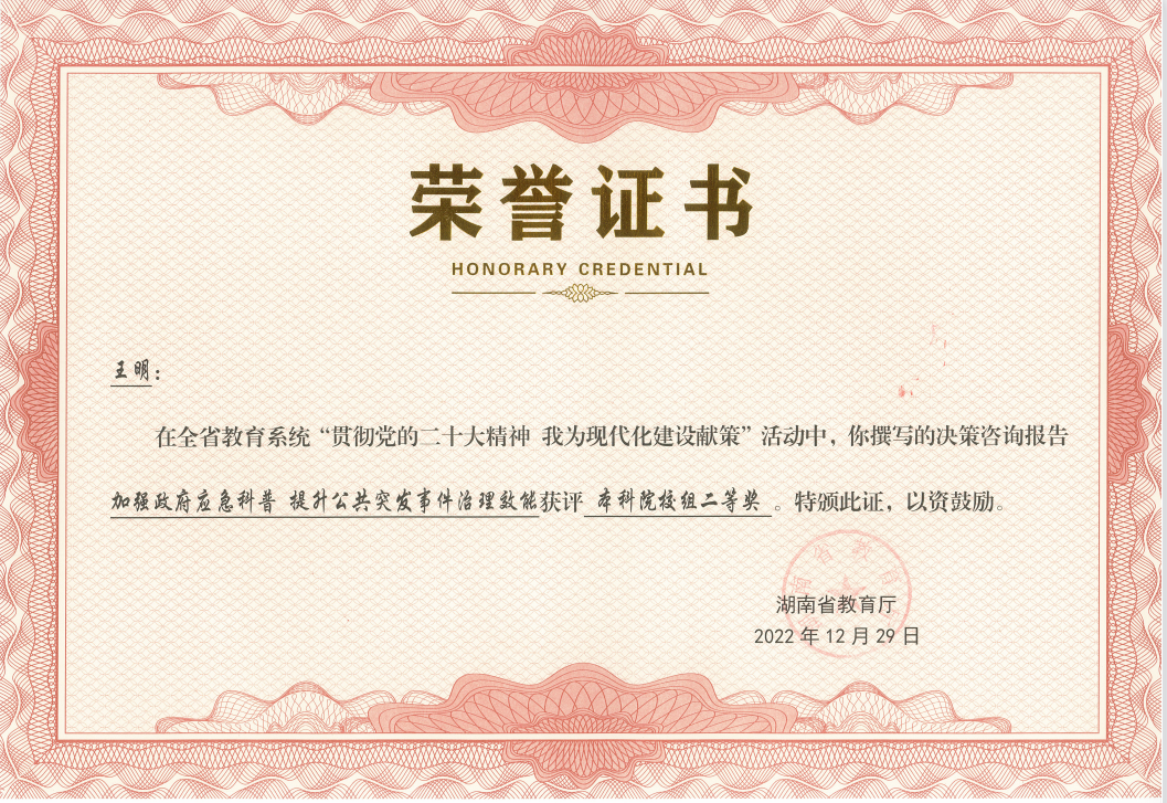 老师获得其余4个奖项,其中王明的《加强政府应急科普 提升公共突发事件治理效能》获二等奖,宋智敏、区慧霞的《着眼民生热点:推动我省人大电梯安全立法》、胡之芳、朱宝桦的《完善企业产权保护,构建对涉罪企业财产处置的动态审查监管机制》、黄素梅、王若彤的《全过程强化高校职能部门风险防控体系》荣获三等奖。