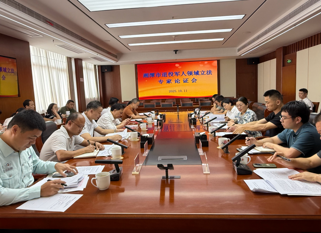 为深入贯习近平总书记关于退役军人的重要论述,全面推进退役军人服务与保障落实落地。2025年10月11日下午,湘潭市退役军人领域立法专家论证会在湘潭市人大常委会召开,色色动漫副院长宋智敏教授、朱正余副教授、法律硕士生向诚组成的立法团队出席了本次会议。