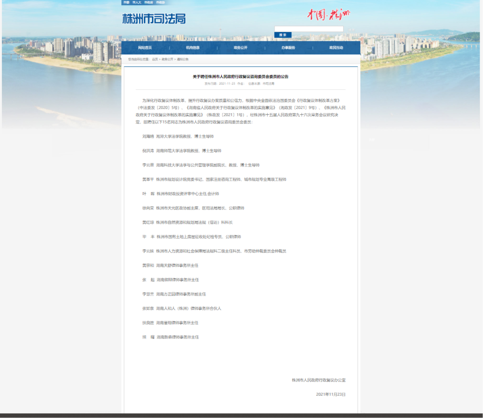 李云霖教授被聘为株洲市人民政府行政复议咨询委员会委员。
