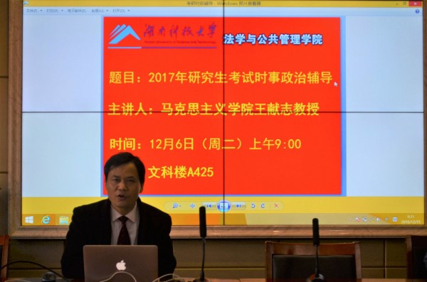 特邀马克思主义学院王献志教授于12月6日上午9点于文科楼A425,面向即将考研的同学们做考研时事政治辅导。本次讲座由叶军副书记主持,辅导员伍安出席,2013级学生参加讲座。 王献志教授多年来关注考研时事政治,拥有丰富的辅导经验。讲座伊始,王教授从考试题型入手,简要分析单选题、多选题、分析题答题技巧,并对时间分配提出建议。而后又从国内、国际两个方面展开,详细讲解考试范围。王教授强调:“对于当代世界经济和政治,同学们应着眼于党和政府近阶段重大方针政策,关注体现其‘德政’的社会事件。至于国际方面则以中国对国际时局的认识和主张为重。” 随后王教授以时间为基轴,分条列举国内外2016年1月至11月国内外重大时事。王教授还以“生态优先,绿色发展”、“供给侧改革”、“资源税制改革”等政策为重点,进一步分析了科技领域的重大成就。他提醒大家一定要深入了解东盟共同体、中东民族与宗教矛盾、伊朗核问题等核心要点。针对本年度热点问题——英国脱欧,他特别指出:“脱欧派的胜出引起了一定程度上的民粹主义,大家对此要采取批判的态度,并从逆全球化角度分析。” 讲座结束后,一名同学表示:“王教授明确了时政的复习方向,带来了新的答题视角,使我受益匪浅。特别感谢老师,也感谢学院给予我们的关心和帮助。” (责任编辑:admin) |