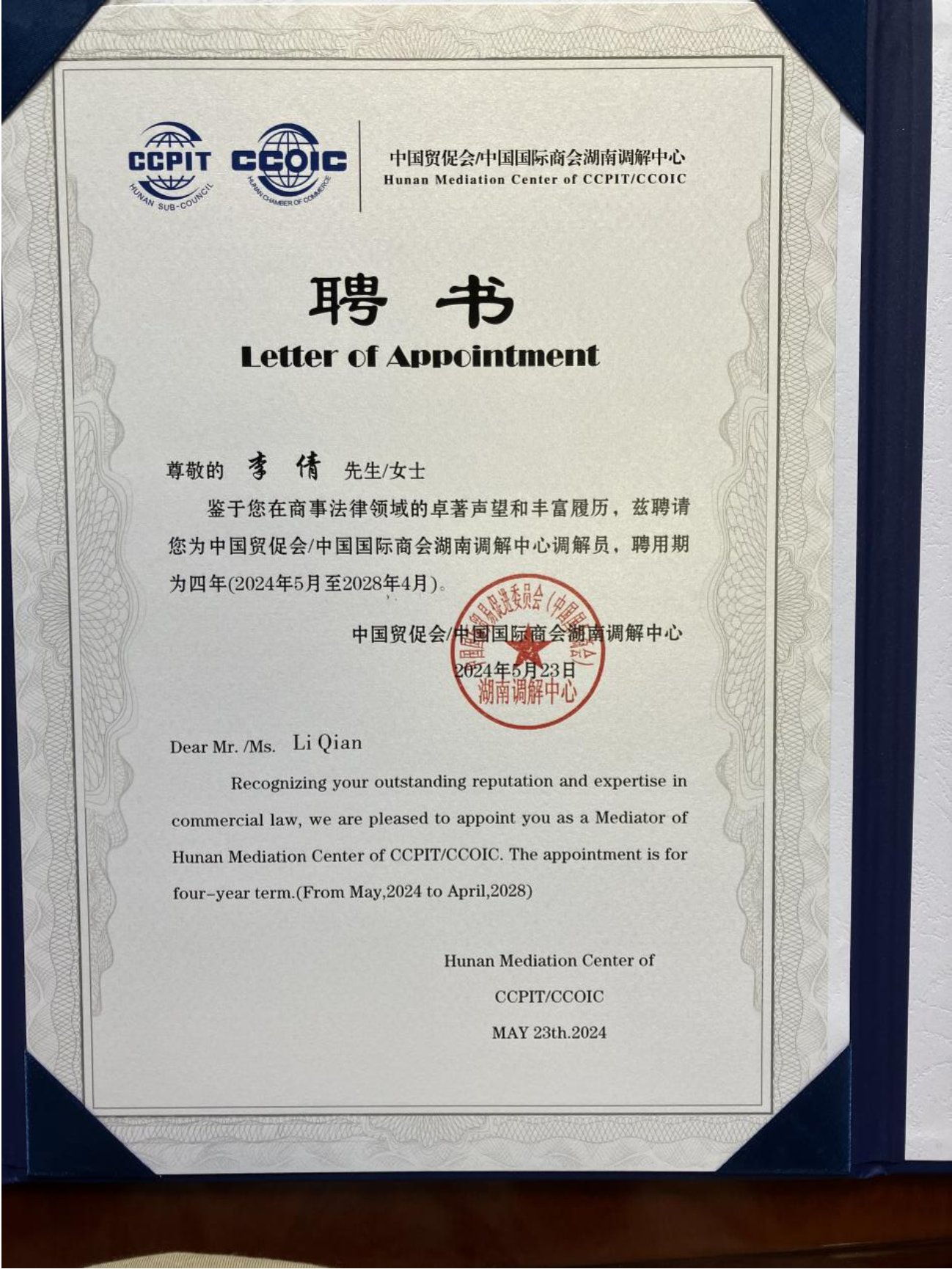 李倩老师受聘为中国贸促会/中国国际商会调解员