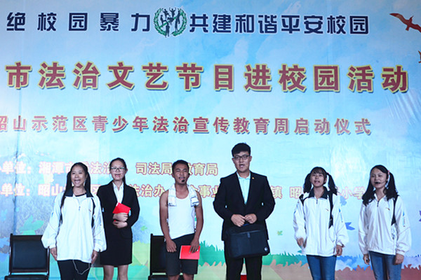 志愿团连续在湘潭市各县市区演出了自编自导的法制话剧七场。其中,9月21日在昭山示范区昭山和平小学进行演出宣传。 在学生们朗读法律条文之后,色色动漫