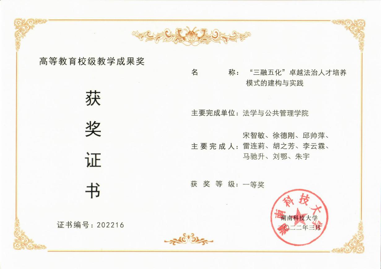 宋智敏教授领衔团队申报的《“三融五化”卓越法治人才培养模式的构建与实践》荣获校级教学成果一等奖,并推荐参评省级教学成果奖。
