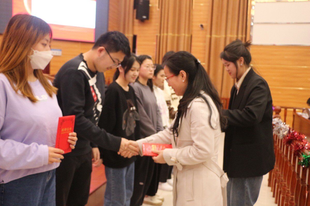 志愿团分会会长杨妍为上届优秀志愿者颁发荣誉证书。他们的志愿行为就如暗夜里的一抹星光,照亮了他人前行的路,也照进了每个人的心房。上届副会长曾智森致辞,他表示做为一名志愿者要坚守初心,他是这样说的也是这样做的:在校期间,他参加了十多次义务支教;在校外,他是湖南省志愿中心的一名志愿者,为血液病儿童尽力提供帮助。他希望同学们积极参加并努力做好志愿活动,志愿活动看似平凡却能给很多人带来温暖与爱。他表示,在若干年之后回想起志愿活动的点点滴滴,仍能感受到美好与温暖。