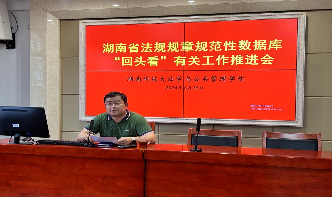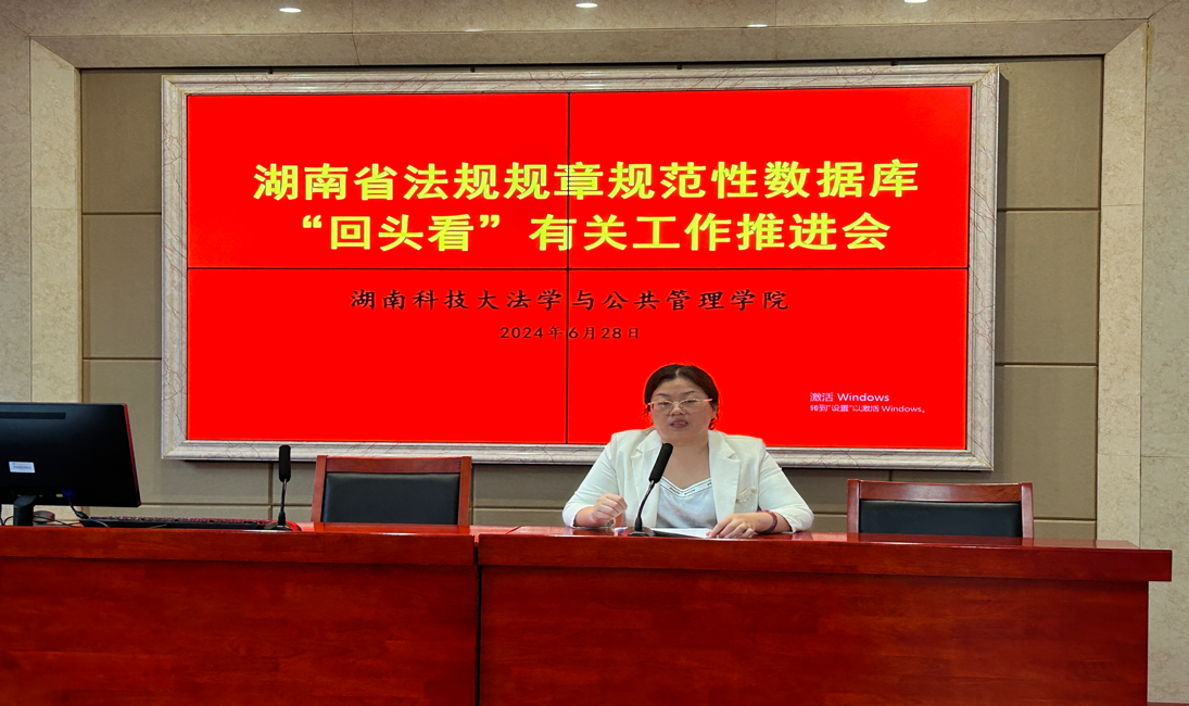 在立言楼A425召开湖南省法规规章规范性数据库“回头看”有关工作推进会。会议由院长邱帅萍教授主持,副院长、省人大常委会立法研究基地执行主任宋智敏教授、校法务中心主任马驰升副教授以及所有法科教师参加了会议。