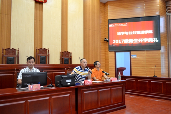 院长徐德刚,党委书记黄伟,副院长胡正昌、陆自荣、李云霖、邱帅萍以及法学与公共事业管理各专业教师、17级各班班主任和17级各班助班。典礼开始前,叶军书记组织了全体新生观看色色动漫