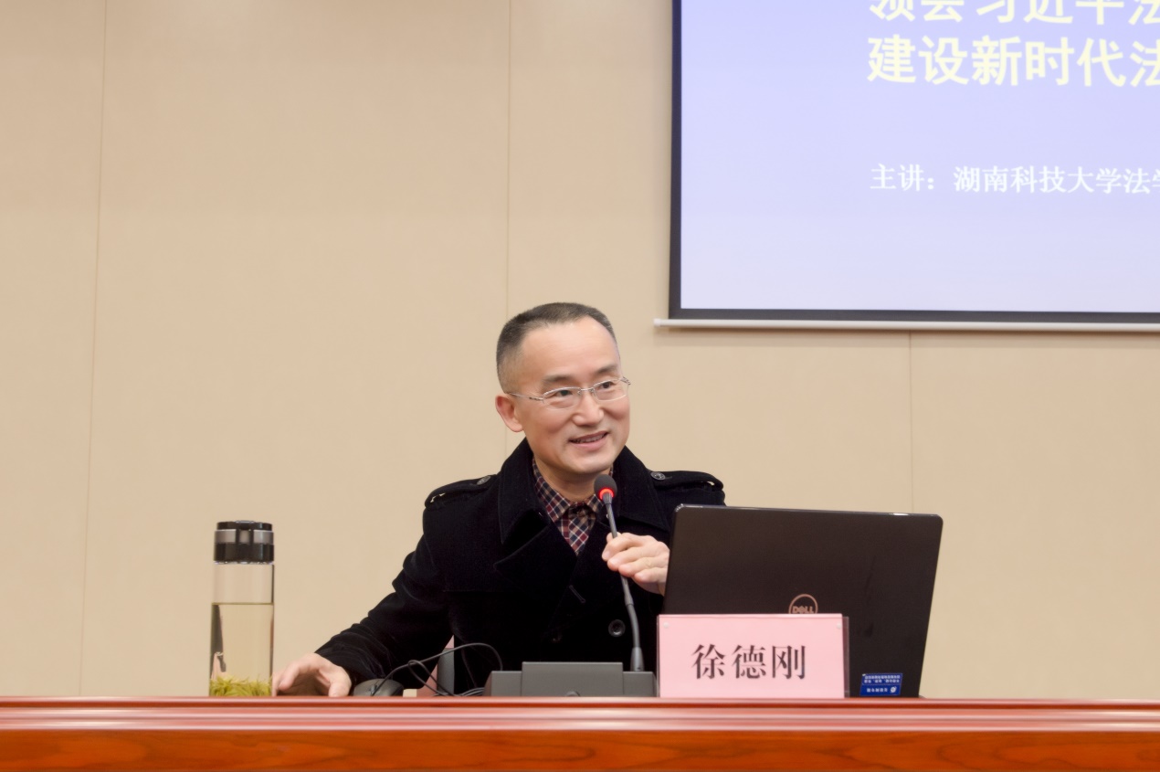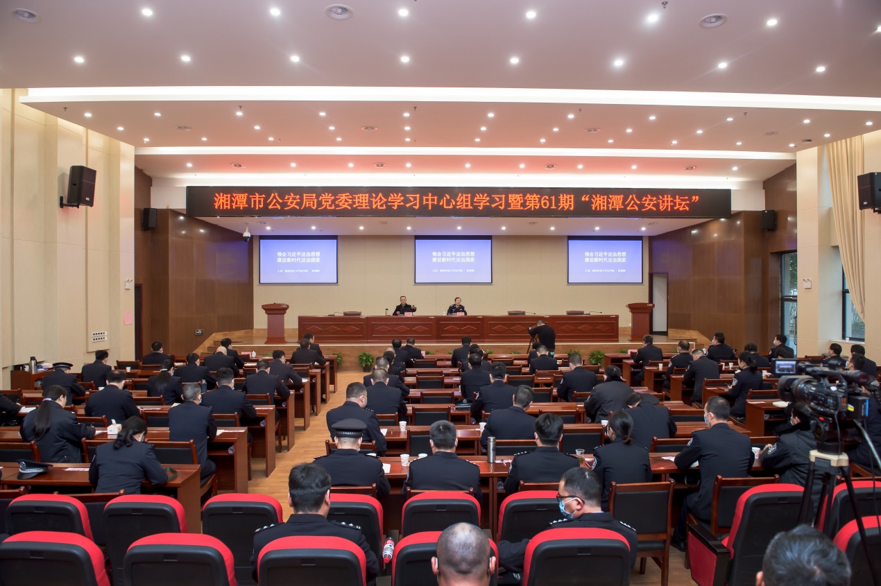 徐德刚教授在市公安局警官培训中心为市局党委理论学习中心组暨第61期“湘潭公安讲坛”作了一次专题讲座。授课以《领会习近平法治思想建设新时代法治国家》为主题,从习近平法治思想产生的背景、主要内容及实践、贯彻落实“习近平法治思想”的举措等三个方面作了详细解读,旨在深入推进全市公安机关学习、实践习近平法治思想。参加学习的有市公安局党委班子成员,各县市区局(分局)、驻局纪检监察组、局直各单位主要负责人等共计一百余人。同时,现场讲座录音录像将发放全市民警学习。湘潭市人民政府副市长、市公安局长罗伟主持讲座并全程参与学习。讲座受到与会人员一致好评。