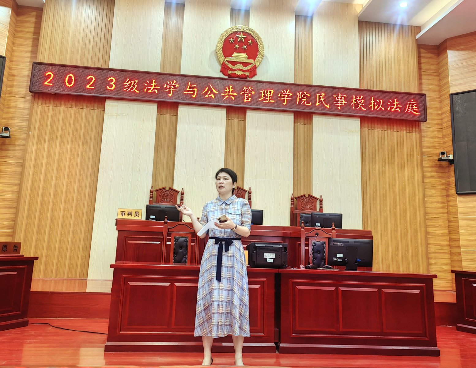 5月14日上午8点,23级法学5-6班、23级潇湘法学1-2班于立言楼模拟法庭开展民事诉讼法实践课——民事模拟法庭活动,法学系向明、左洪剑、张美玲、喻军等老师到场对活动进行了指导和点评。