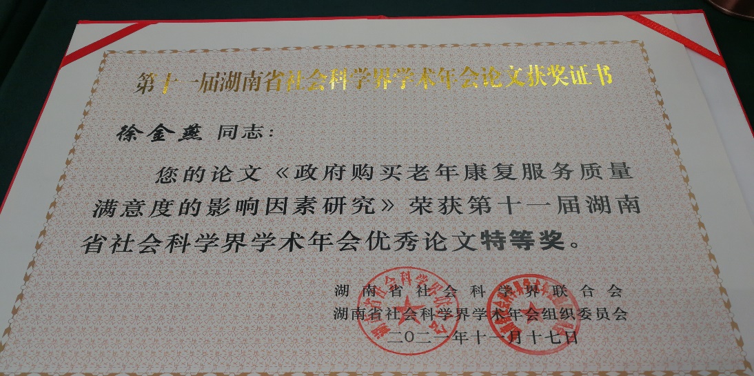 徐金燕老师撰写的《政府购买老年康复服务质量满意度的影响因素研究》荣获特等奖。
