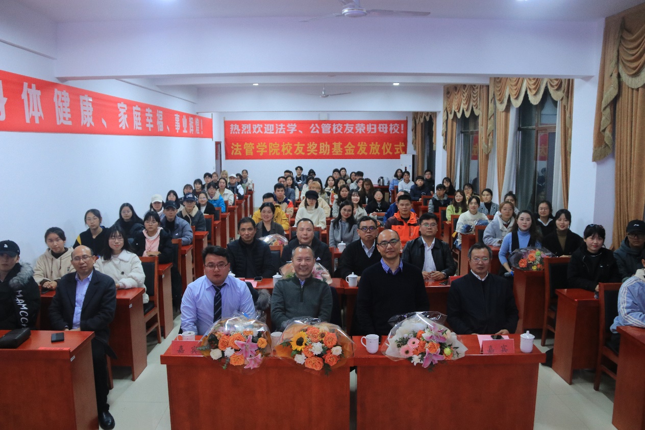 校友奖助基金发放仪式在立言楼425会议室隆重举行。出席本次活动的优秀校友有贵州校友会法学分会会长、法管学院校友基金理事会主席朱小波先生,贵州校友会法学分会副会长、法管学院校友基金理事会理事徐伏良先生,深圳校友会法学分会会长、法管学院校友基金理事会理事陈科军,大湾区校友会法学分会会长、法管学院校友基金理事会理事谢兰才先生,大湾区校友会法学分会秘书长、法管学院校友基金理事会理事陈悦英女士,长沙校友会法学分会会长、法管学院校友基金理事会理事韩祥先生,长沙校友会法学分会秘书长、法管学院校友基金理事会理事李萍女士,及公管01级校友冯玉峰先生,法学校友李妲。出席本次活动的嘉宾有学院党委书记黄伟、副院长胡正昌、副院长李云霖、副书记蒋会平和系部教师代表戴年红、喻军、夏飞明,以及学工全体老师,获奖学生代表、学生干部代表参加活动。