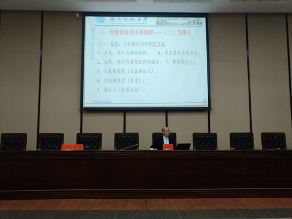 李云霖教授在湘潭市人大常委会进行了题为“法治政府建设中的行政诉讼制度”讲座。讲座由湘潭市人大常委会韩晓秘书长主持,湘潭市人大常委会杨建业副主任、潘爱民副主任、阳建民副主任、湘潭市人大各位专门委员会主任与副主任,以及市人大常委会机关的其他工作人员到场参加。 李云霖教授从行政诉讼制度与十八大以来法治政府的决断、行政诉讼制度的主要法律和司法解释、法治政府建设中的行政诉讼主要制度三方面进行了深入阐释。围绕法治政府建设,萃取了十八大以来历次重要大会中关于法治政府的关键内容,及其与行政诉讼制度的联系进行分析。关于行政诉讼制度的法律渊源,介绍了行政诉讼制度的主要法律和司法解释的最新进展,及其对法治政府建设的实效影响。受案范围、当事人、跨区域管辖、立案登记、起诉期限等行政诉讼的具体制度,则在一个个生动的案例中得到通俗的表述和深刻的解释。 湘潭市人大常委会高素质工作人员及其崇法和学法精神,为讲座营造了生动活泼的氛围。最后,韩晓秘书长进行了精彩点评,整场讲座在热烈的掌声中圆满完成。 (责任编辑:admin) |