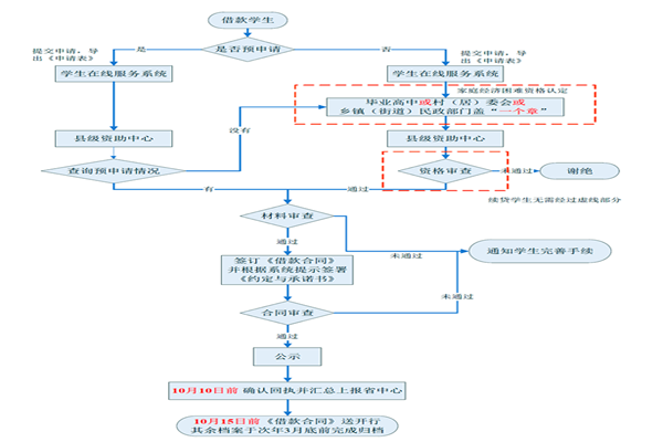 备注(新内容):A 借款学生需每年至少两次登录学生在线服务系统维护个人信息。登录次数不足时,借款学生无法提交续贷申请(系统已开通自动校验功能),县级资助中心应指导学生现场登录维护。 B 借款学生应登录学生在线服务系统填写续贷声明。 注意事项:申请审核会被计入年度考核,县级资助中心必须对申请贷款学生的申请材料和系统信息进行一一比对,确保系统信息和纸质材料一致。 三、合同签订与审查 (一)合同签订 1 、严禁由其他人代替借款学生或共同借款人本人签订《借款合同》; 2 、续贷时,由到场一方(借款学生或共同借款人)签订《借款合同》并分别签署借款学生和共同借款人的姓名,并在代签处注明代签人。如学生张三办理时,在借款学生签字位置签署“张三”,在共同借款人签字位置签署其共同借款人姓名“李四(张三代签)”。严禁由其他人代替到场一方本人签订《借款合同》; 3 、县级资助中心应现场核对借款人和共同借款人的签字内容与其身份证姓名一致。 4 、合同签订只须签字,无须捺印。(新内容) (二)回执录入 开行生源地信用助学贷款的回执录入截止时间为申请当年10 月10 日。10 月10 日后高校未在助学贷款信息管理系统录入回执的,视同借款学生撤销当年开行生源地信用助学贷款申请。 (三)组织公示(新内容) 县级资助中心应在合同签订后组织以乡镇(街道)为单位对借款学生进行公示。公示内容包括借款学生姓名及其户籍所在村(社区)名称。公示期间,县级资助中心公布统一的投诉意见电话,对公示发现的问题,应组织乡镇(街道)进行调查核实。对于确实不符合贷款条件的借款学生应谢绝其贷款申请。县级资助中心应根据公示结果起草《生源地信用助学贷款公示情况说明》。 注意事项:县中心应审慎谢绝合同。 四、汇总上报 1 、县级资助中心应于10 月10 日 前完成回执确认工作,并在助学贷款信息管理系统内完成申请汇总,导出《××县资助中心生源地信用助学贷款申请汇总表》,审核无误后加盖公章。 2 、10 月15 日 前,县级资助中心将盖章后的《申请汇总表》、《生源地信用助学贷款公示情况说明》和一份《借款合同》提交省资助中心。 3 、省资助中心审核通过后,在助学贷款信息管理系统内完成本省汇总,导出《××省生源地信用助学贷款申请汇总表》(以县级资助中心为单位),盖章后随同各县提交的《生源地信用助学贷款公示情况说明》、《借款合同》报开行审批。 4 、受理结束后,县级资助中心应于次年3 月底前完成信贷材料的归档工作。 生源地信用助学贷款申请受理流程图 备注:我省确定的统一资格审查单位是村(居)委会。 (责任编辑:admin) |
