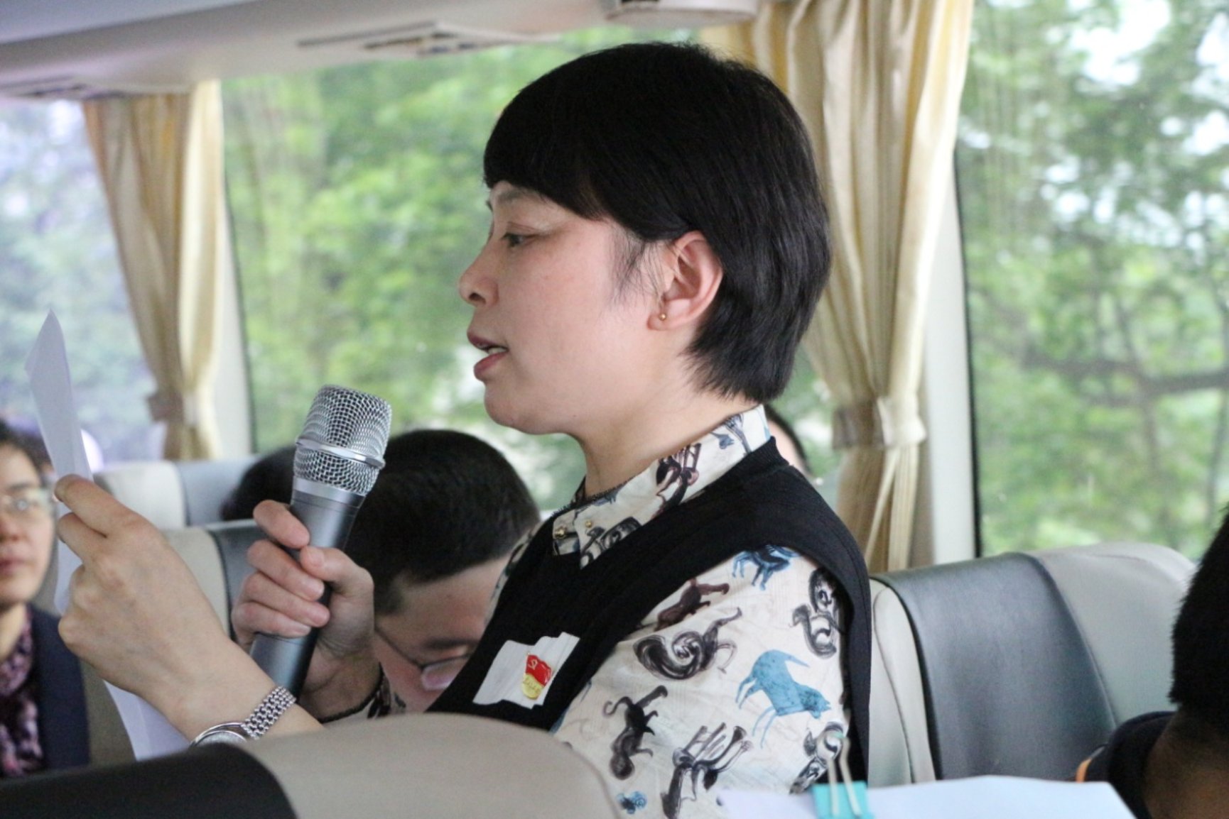 在前往参观的车程中,全体党员教师开展党史知识抢答活动,党员同志们踊跃参与,现场气氛活跃。
