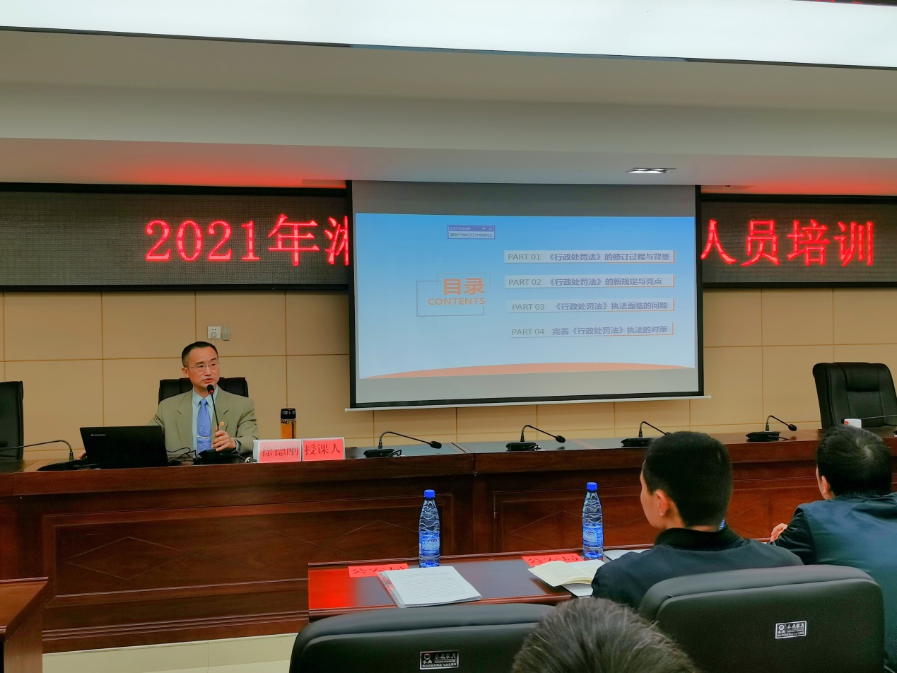 讲座开始,徐教授从行政执法中的问题导入,阐述了《行政处罚法》的修订背景,介绍了新法的新规定及亮点,分析了当前行政处罚面临的问题,并对新法的贯彻实施提出了自己的建议。徐教授讲课激情满满,联系实际,条理清晰,语言幽默,会场气氛热烈,讲授受到与会人员的一致好评。课后,还与部分执法干部就相关实际问题进行了深入交流。