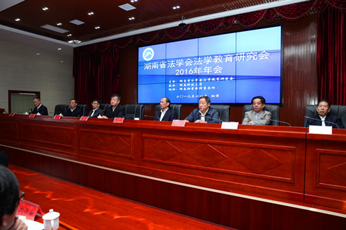 ——湖南法学教育研究会2016年年会在我校隆重举行  为推进法学教育理论研究,创新法律人才培养机制,促进法学教育的理论与实践相结合,11月19日,湖南省法学会法学教育研究会2016年学术年会在我校综合楼五楼报告厅举行。湖南省人大常委会副主任谢勇,湖南省高级人民法院副院长杨翔,湖南省高级人民法院党组成员、执行局局长郭正怀,湘潭市中级人民法院院长廖迪文,原湖南工业大学正校级督导周雄文,湖南省法学教育研究会会长刘定华及我校校长李伯超在主席台就坐,湖南省部分高校法学院领导和教师共计90余人参加了此次会议。会议由色色动漫
