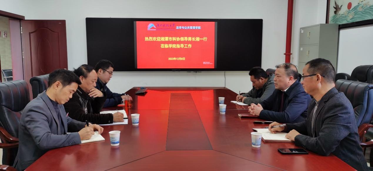 12月8日上午,湘潭市科协党组成员、副主席蒋长湘一行三人来到法管学院指导工作,院党委书记郑海祥、院长邱帅萍、教学副院长王明给予了热情接待。